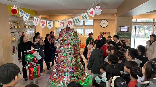 지난 19일 서울창경초등학교 학생들은 앞서 ‘사랑의 라면 트리’를 만들고 이날 트리에 불을 밝혔다.
